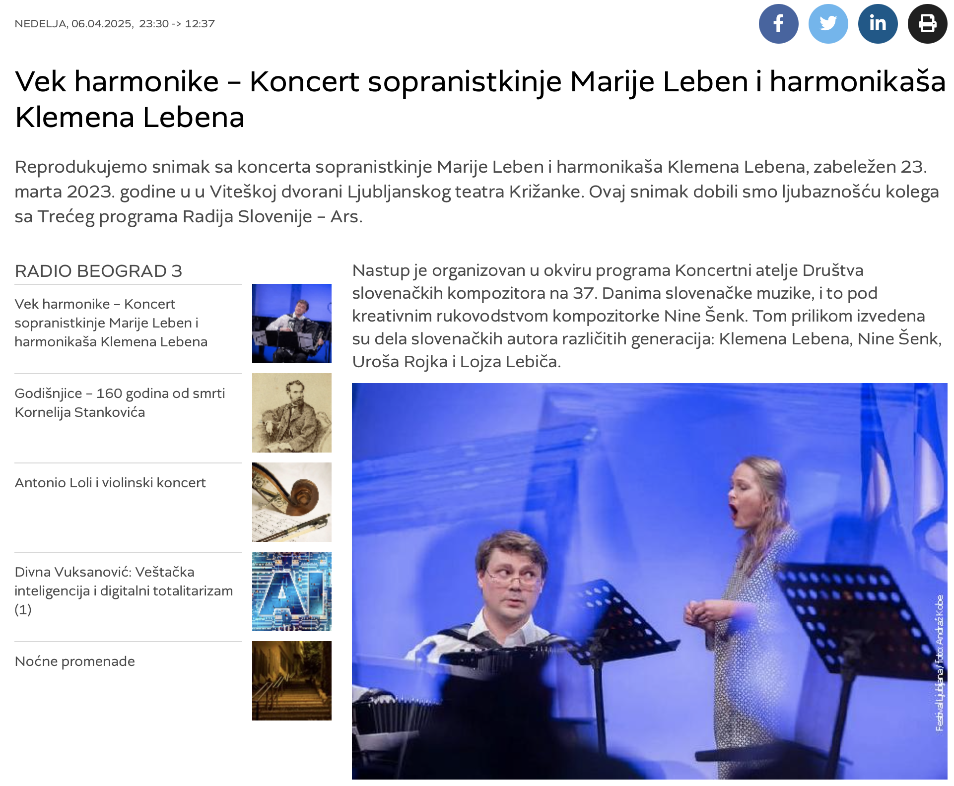 Leben featured in the radio broadcast Era of Accordion by the Serbian National Broadcasting Company